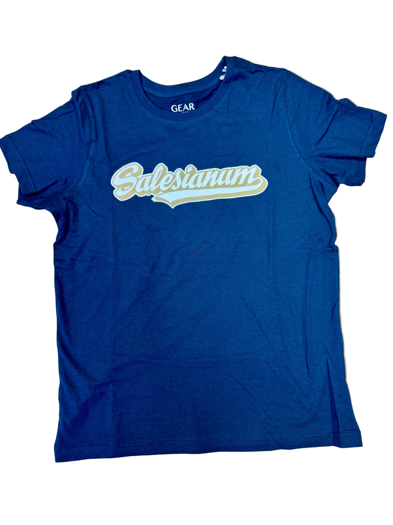 Navy woman’s tee with white and gold Salesianum script. Available in sizes Small to 2XL.